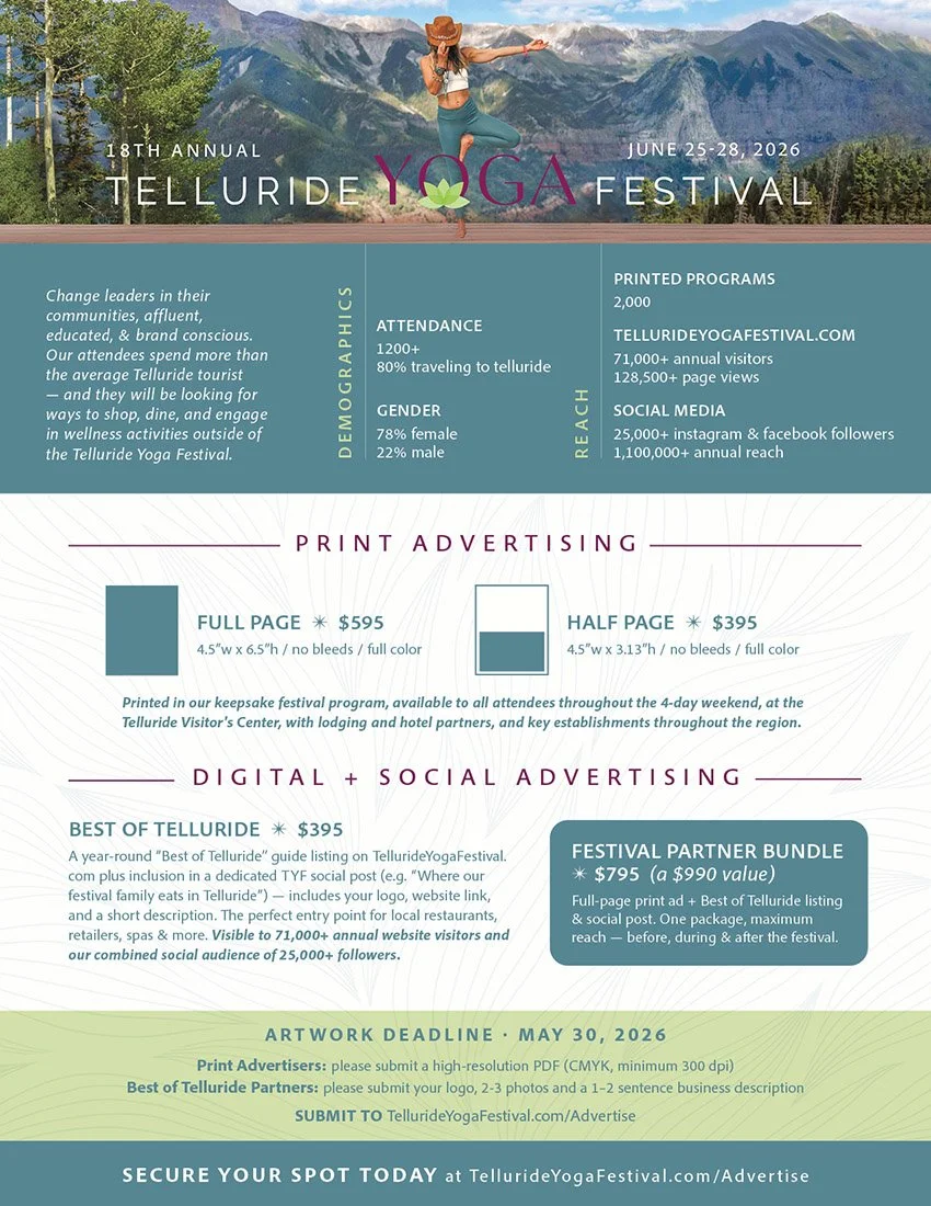 A year-round "Best of Telluride" guide listing on TellurideYogaFestival.com plus inclusion in a dedicated TYF social post (e.g. "Where our festival family eats in Telluride") - includes your logo, website link, and a short description. The perfect entry point for local restaurants, retailers, spas & more. Visible to 71,000+ annual website visitors and our combined social audience of 25,000+ followers.